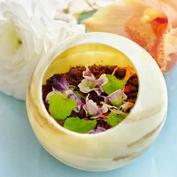 Меню цветочной кондитерской менятся, в зависимости от сезона. Самыми популярными блюдами являются пирожные в виде цветочных горшков из шоколада, наполненные Панна Коттой, и восхитительные бисквитные пирожные, украшенные цветами, шоколадом и мороженым, кремом или муссом.