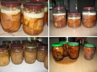 2. Далее мясо обрабатывают - тушат или запекают - и укладывают горячим в стерильные банки, заливая бульоном, соусом или рассолом. Банки лучше брать стеклянные и желательно небольшого объема - до 1 литра.