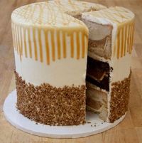 Каждый слой-пирог после выпечки сначала замораживается, а после из них собирается торт, прослоенный кремом на основе сливочного сыра и покрытый дождем соуса из карамели и дробленным орехом пекан.