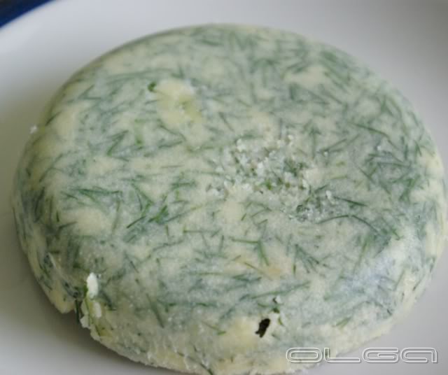 Размягченное масло смешать с небольшим количеством муки (примерно 1 чайная ложка) и укропом, поставить в морозильник. Затем посудину подержать в горячей воде и вынуть масло.