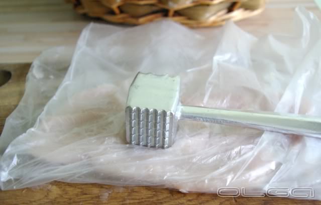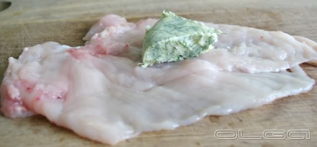 С грудки курицы снять филе, каждую грудку разрезать вдоль на 2 части. Отбить молоточком. Посолить, поперчить.