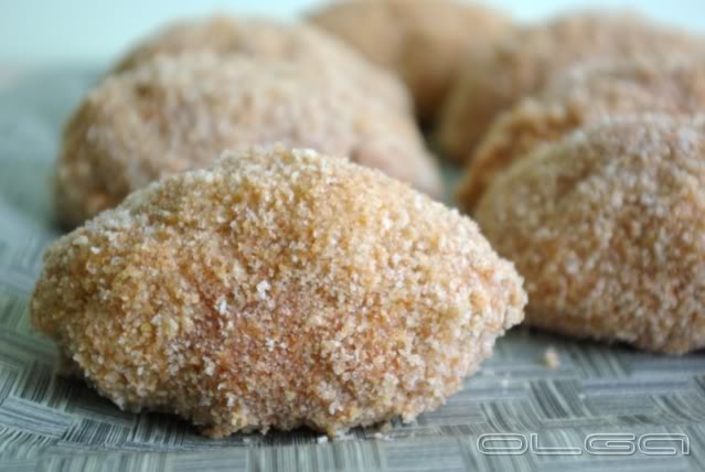 В серединку положить кусочек масла. Завернуть, обвалять в муке, обмакнуть в яйца, взбитые с молоком, затем в панировочные сухари, опять в яйца и повторно в сухари