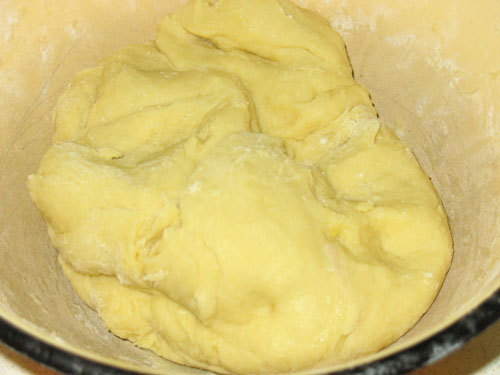 Творог взбить с сахаром, манкой желтками и сметаной. Отдельно взбить белки в пену и ввести в начинку.