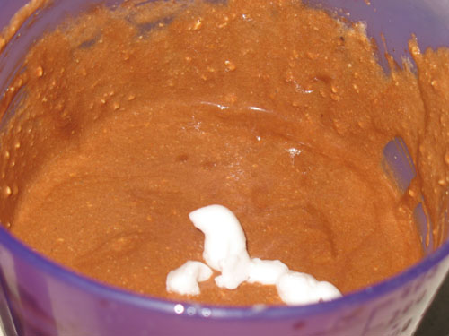 Взбить желтки с сахаром и творогом, добавить сметану, шоколад и желатин. В конце вмешать взбитые в пену белки.