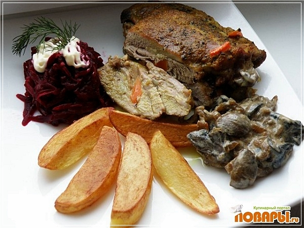 Завернуть в фольгу и на 40 минут в духовку, t 200 градусов. Затем открыть фольгу, полить образовавшимся соком и подержать в духовке еще минут 15. Бедро получается нежное, мягкое. И очень легкое.