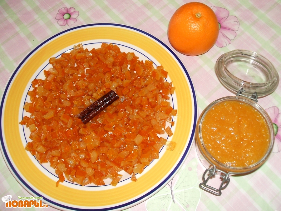Рецептов апельсиновых цукатов в инете великое множество. Я хочу поделиться с вами лично своим рецептом. На фото цукаты ещё горячие и поэтому не посыпаны сахаром. Цукаты и повидло можно использовать в выпечку, кремы, можно добавлять в чай. Получается очень вкусно!