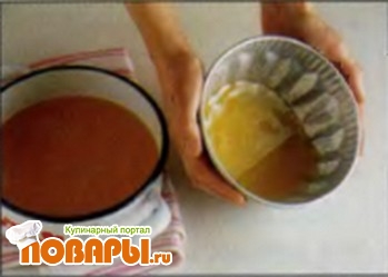 В замороженную форму налейте стакан жидкого желатина, вращая форму так, чтобы покрыть желатином стенки. Поставьте в холодильник для застывания.