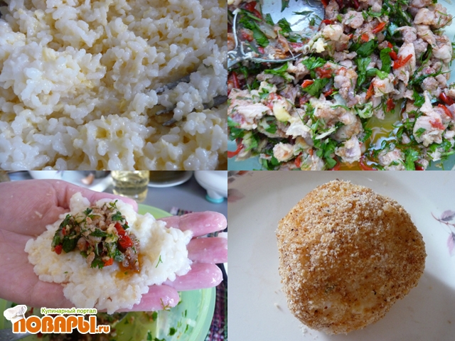 Рис отварить в подсоленной воде, добавить сливочное масло и мелко натертый сыр. Одно яйцо взбить и соединить с рисовой массой, хорошо размешать. Смочить руки водой, взять горстку риса объемом с куриное яйцо и размять на ладони. В середину положить 1 ч. л. мясной начинки и сформовать шарик. Так же приготовить все аранчини.