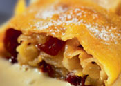 Нагреть духовку. Выпекать штрудели 45 мин до золотистого цвета, при этом время от времени поливать сливочным маслом. Вынуть из духовки и еще горячими посыпать сахарной пудрой. Подавать теплыми, с ванильным соусом.