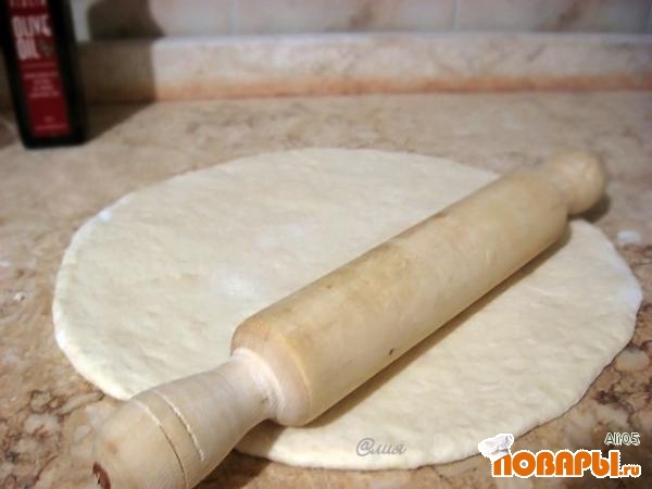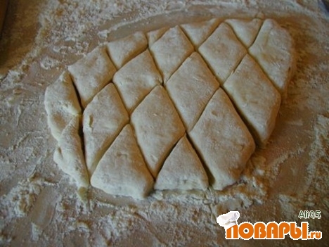 Тесто делим на небольшие части и раскатываем толстой лепешкой (1см), нарезаем ромбиками со сторонами примерно 3-4 см.