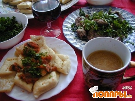 Кидаем в кипящий бульон, как всплыли - варим еще примерно минуту. Хинкал должен стать пышной, толстой лепешечкой,тогда лепешки не сдуются и не посинеют.