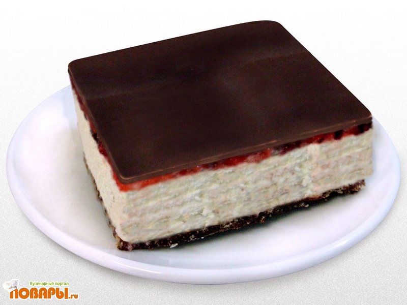 Форму с застывшей творожной массой опустить на несколько секунд в горячую воду и осторожно выложить содержимое на подготовленный корж. Смазать сверху густым фруктовым джемом и обмазать весь торт чуть теплым, растопленным на водяной бане шоколадом. Поставить в холодильник на ночь.