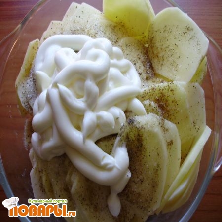 Самое трудоемкое – картофель. Режем как на «чипсы» (кружки тоненькие), солим, добавляем кориандр, перец и майонез. Ложкой мешать – не вариант, а вот руками очень удобно.