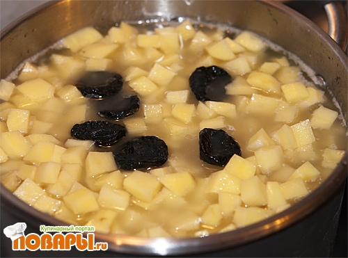 картошку можно целую но я предпочитаю порезанную на кубики, добавим алычу или чернослив.