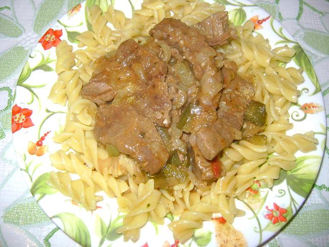 Затем добавить мелко нарезанный маринованный огурчик, приправу, томатную пасту, немного воды и тушить до готовности мяса.