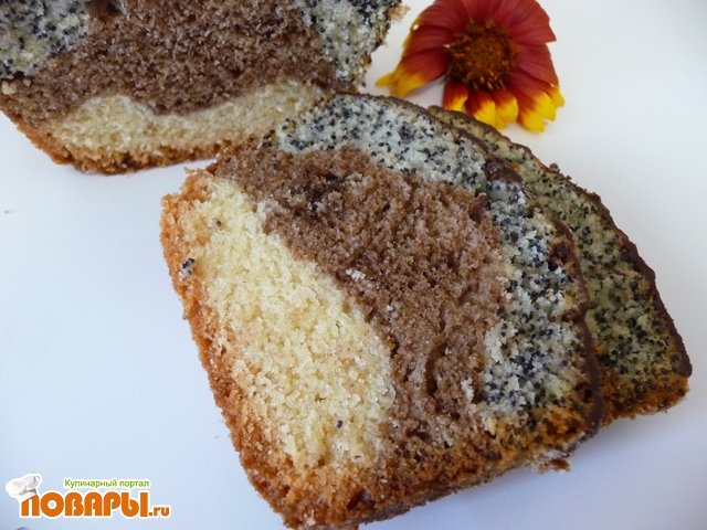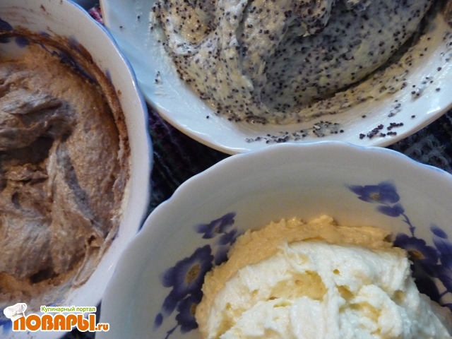 Тесто разделить на 3 части. Одну оставить, в одну добавить мак, а в другую - какао.