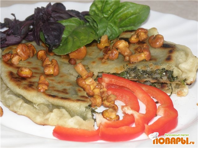 Тесто разделить на 8 частей и раскатать тонкие лепешки. Разложить на 4 лепешки равное количество зелени, накрыть оставшимися лепешками и защипать края. Обжаривать на растительном масле на небольшом огне 4-5 минут с каждой сторны.