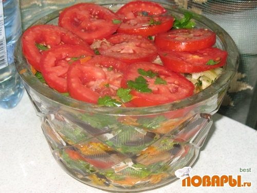 Морковь шинкуем мелкой соломкой и прижариваем слегка на растительном масле, помидоры режем пластинками, болгарский перец режем соломкой, чеснок мелко рубим, укроп и петрушку мелко режем.