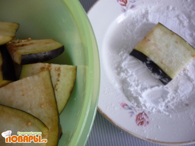 Баклажаны режем пластинами среднего размера. Солим, даем постоять минут 15. Затем обваливаем в крахмале и обжариваем на растительном масле.