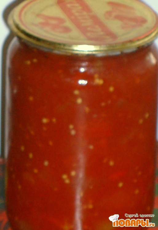 В стерильные банки, закатать, под шубу на 24 часа. Выход — 8 банок по 700 мл.