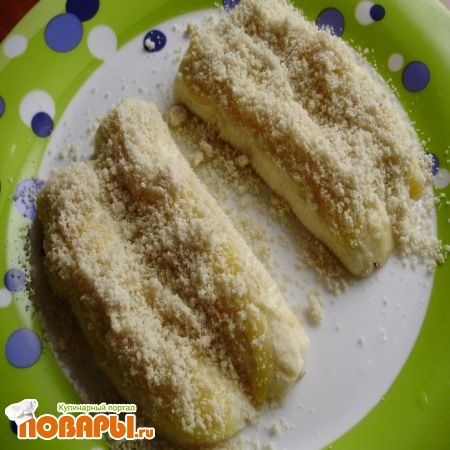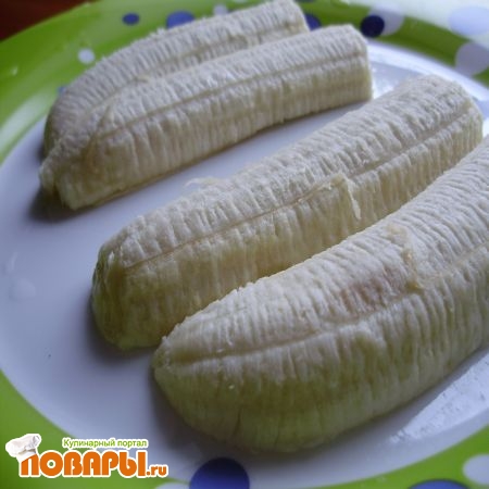 Бананы нужно помыть, шкурку снять и нарезать. Можно порезать и пополам, но только вдоль. Я режу обычно их еще раз пополам. Порезанные бананы лучше всего выложить на плоскую тарелку, желательно большую.