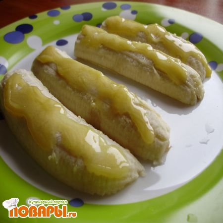 Порезанные бананы смажьте медом, но совсем немного: можно тонкой полоской по самому верху. Бананы должны лежать срезом вниз, так как сам срез намазать медом у вас не получится, он «скользкий», мед с него просто «скатится».