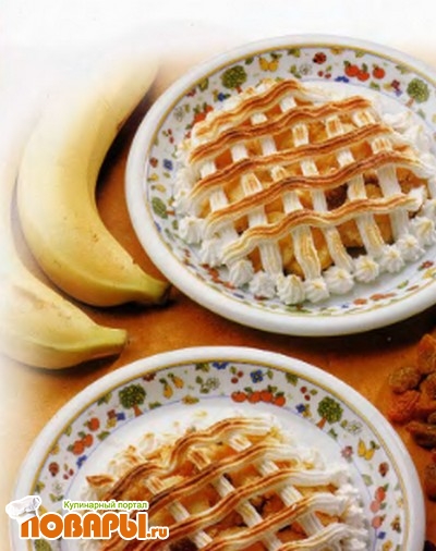 Наполните кондитерский мешок взбитыми белками и выдавите на банановую смесь полоски безе, формируя сетку. Украсьте розочками из безе и поставьте под горячий гриль. Оставьте безе слегка подрумяниться, выньте из духовки и подавайте.