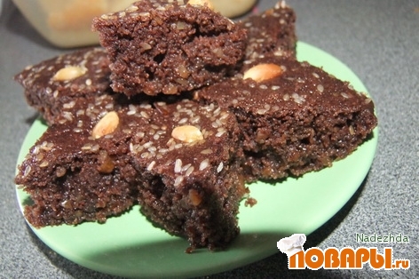 Смешать сухие компоненты, добавить масло и соду, гашеную в кефире, переложить в смазанную маслом форму (слой не больше 1 см), разровнять, воткнуть орешки и выпекать до золотистого цвета (около 20 минут).
