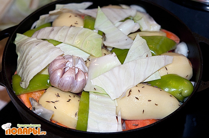 Второй слой - это наше мясо, в моем случае это баранина и говядина. Выкладываем мясо жиром вниз.