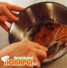 Размешайте венчиком желтки с сахаром: нет необходимости взбивать их, достаточно только хорошо перемешать ингредиенты.
