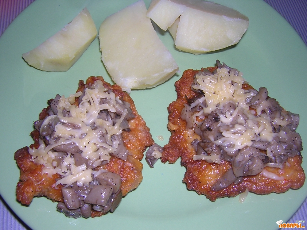 На каждый куриный "оладушек" положить по 2 ст.л грибов и посыпать тертым сыром.