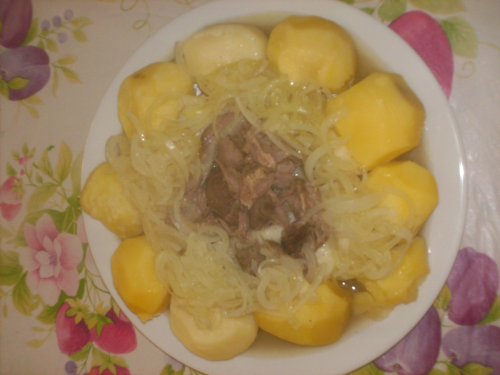 На подготовленное блюдо в середину выкладываем готовые сочни, вокруг обкладываем вареным картофелем, а в середину выкладываем мясо. Перед подачей на стол блюдо поливают готовой подливкой и посыпают зеленью.