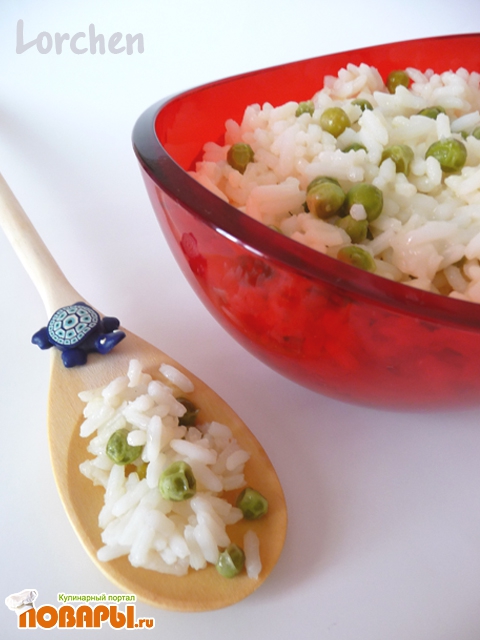 Уменьшить огонь до минимального, добавить зеленый горошек, не перемешивая, варить еще 20 минут, рис должен стать рассыпчатым. Осторожно перемешать плов перед подачей.