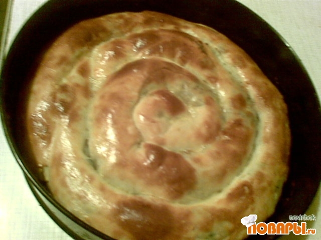 Укладываем в форму для выпечки в виде спирали и смазываем яйцным желтком.получается как слоеный пирог с начинкой.