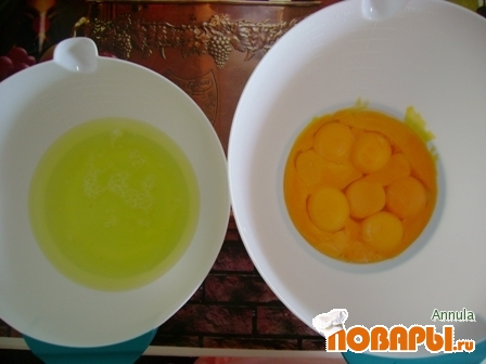 Отделить белки от желтков. Белки пока убрать в холодильник, а в желтки добавть половину сахара и взбить до бела.