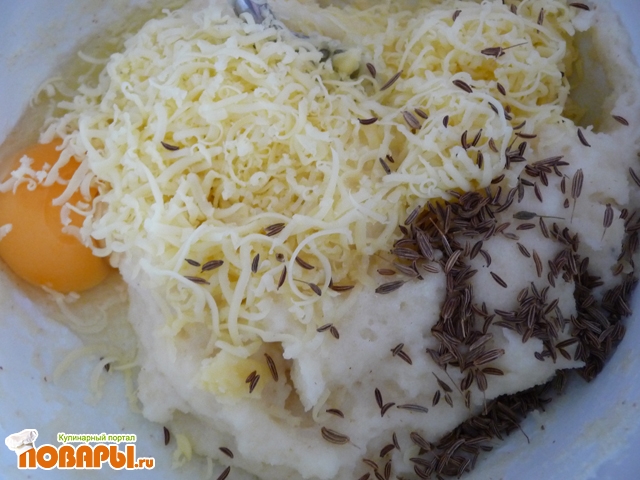 Добавить яйцо, натертый на мелкой терке сыр, тмин, хорошо перемешать.