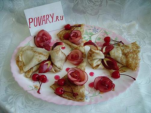 Два блина сложить внахлест промазать сиропом ,вставить шею из яблока сложить блинчики в виде птицы,сверху положить еще один блин свернув кулечком, для пышности хвоста, из яблока сделать крылья.