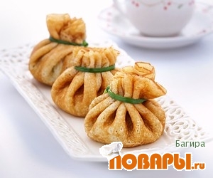 На середину каждого готового блинчика выложить 2 ст. ложки грибного фарша, затем, подбирая края, сформировать блинчик в форме мешочка, обвязать стрелками зеленого лука или нитями сыра чечил. Выложить на тарелку нужное количество мешочков и подать к столу.