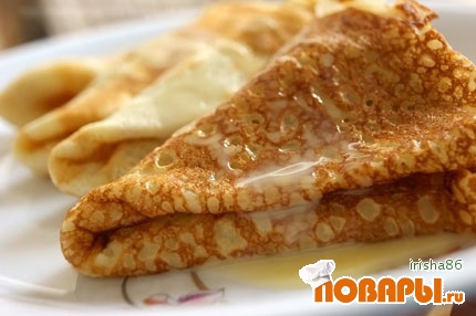 Обжарьте блин с одной стороны примерно 30 секунд и переверните. Переворачивать можно, когда блин стал матовым и на нём начали образовываться маленькие дырочки. С другой стороны блин обжаривается примерно столько же. Если блин при переворачивании рвётся или его края сильно сохнут, Вы добавили в тесто мало муки. Блины на молоке и воде готовы, приятного аппетита.