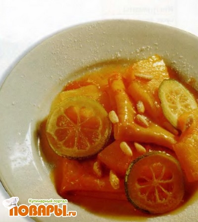 Выньте ломтики ананаса из сиропа, нарежьте кусочками и добавьте в карамель. Разрежьте на тонкие ломтики оставшиеся плоды лайма и тоже добавьте в карамель. Слегка потушите, влейте сок лаймов и апельсина, увеличьте огонь и дайте сиропу загустеть. Влейте джин и подожгите.