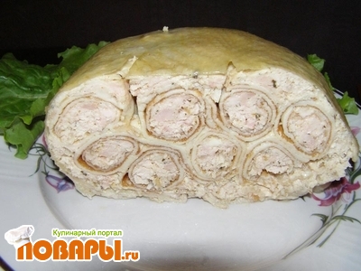 С курочки аккуратно, чтобы не порвать, снимаем кожу.Мясо срезаем с костей и перемалываем в блендере. Добавляем яйцо, брынзу, пассерованную луковицу, пару ложек густых сливок. Соль-специи. Заворачиваем получившийся фарш в блинчики и аккуратно укладываем их в кожу курицы.
