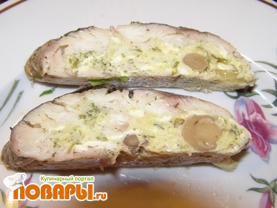 Из рыбы аккуратно вынуть хребет, оставляя часть мякоти на коже. Из вынутой мякоти + яйцо + сыр + зелень + грибы готовим фарш,который и укладываем в рыбу. Соль, перец, специи. Закалываем шпажками и запекаем в Рукаве для запекания в духовке.