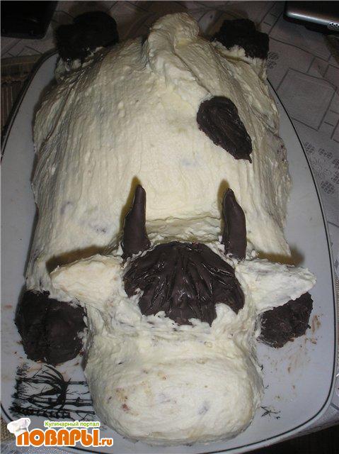 Из большего торта острым ножом начинаем вырезать тело будущей коровы. Затем из меньшего вырезаем голову. из небольших обрезков впереди тела выкладываем небольшую шею, и потом с помошью конфитюра прикрепляем готову. Из оставшихся коржей вырезаем ушки, рожки и делаем передние копытца (задние вырезаются сразу на теле).