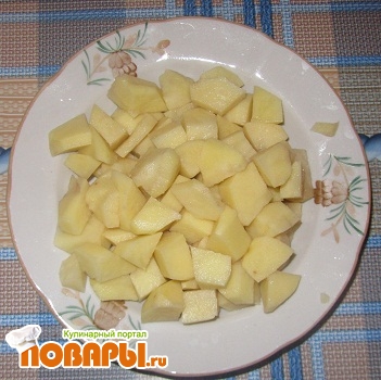 В кипящий подсоленный бульон кладем почищенный и порезанный кубиками картофель, картошка должна быть в меру разваристой.
