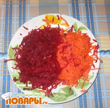 Пока картошка варится, займемся зажаркой. Почистим лук, свеклу и морковь, порезанную луковицу, припустим на сковороде,