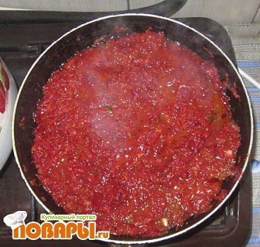 когда овощи зажарятся, вливаем томатный морс и тушим 5-7 минут, если нет морса, добавляем томатную пасту и немного воды.