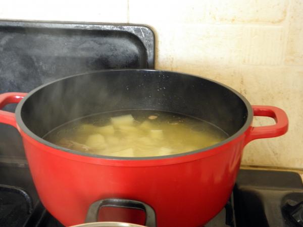 В кастрюлю с бульоном в первую очередь кладу нарезанный картофель и варю его до готовности, добавляю тонко нашинкованную капусту, в самом конце морковно-свекольную смесь с томатом. Все варю до полуготовности.