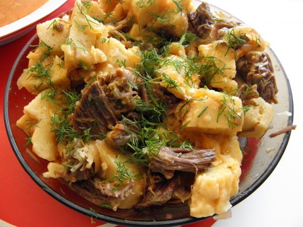 После окончания варки, галушку и куски мяса вынимаем из борща, нарезаем все небольшими кусочками.
