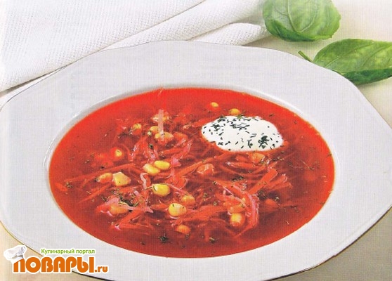 Капусту нарежьте соломкой, опустите в кипящую воду (3 стакана), варите 10-12 минут, затем положите тушеные овощи, кукурузу, посолите, поперчите и варите до готовности.