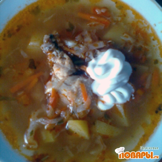 После того как капуста будет почти готова, добавляем заправку и нарезанное кусочками мясо. Ваить еще 15 - 20 минут до полной готовности. После чего добавить соль и специи по вкусу. Убрать с огня, добавить заранее нарубленную зелень и дать настояться 15-20 минут. После чего борщ готов к употреблению.